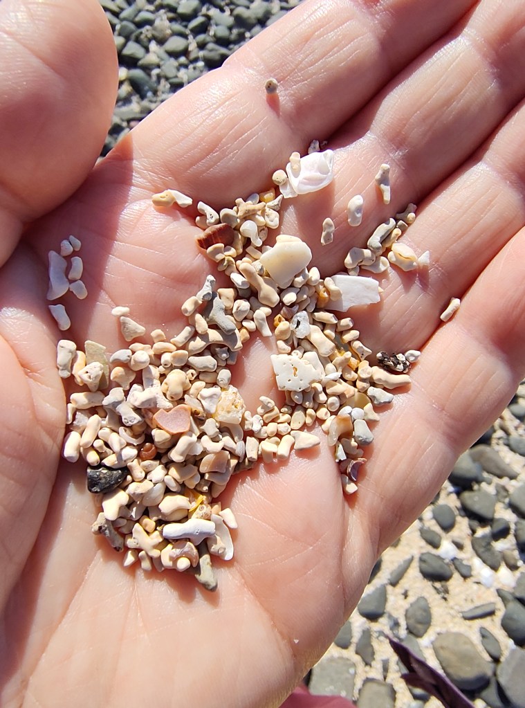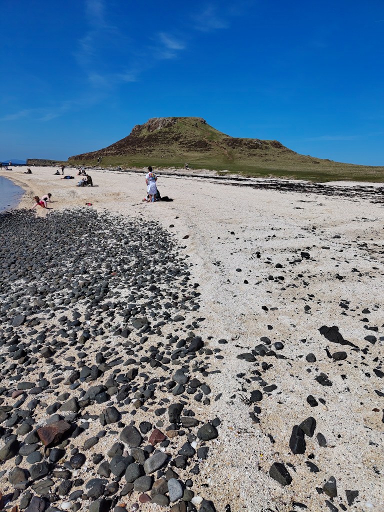 Someone said to me the other day that Skye has no beaches. He is a Harris man – an island which is fringed with wonderful white beaches – so he is biased. But he is broadly right, that Skye is mainly edged with cliffs, and the strands composed of rocks and pebbles. But today we drove up to what is called ‘The Coral Beach’, near Dunvegan – which is a beautiful white. It’s not, in fact, made of coral – nor is it made of sand. The white beach is composed of a zillion smashed up seashells. Pick up a handful and you can see larger and smaller fragments, some less than a grain of rice, but nothing as tiny as a grain of sand. Why do sea shells come here to die? I’ve no idea.